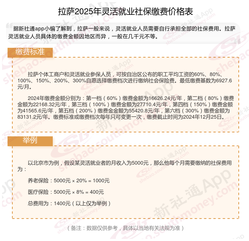 2025年拉萨灵活就业人员社保需要交多少钱?随着经济社会的不断发展,灵活就业群体也日益壮大,其社保缴费问题也愈发受到关注。接下来随新社通APP小编一起来看看灵活就业群体社保缴费问题吧。
