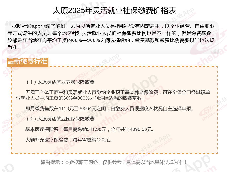随着经济社会的不断发展,灵活就业群体不断地日益壮大,其社保缴费问题也愈发受到关注。那么2025年太原灵活就业人员社保交多少钱,你了解2025年太原灵活就业人员社保缴费基数及比例吗,接下来随新社通APP小编一起来看看。