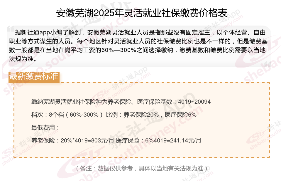 一、2024年安徽芜湖灵活就业社保缴费标准表 安徽芜湖灵活就业社保多少钱一个月?