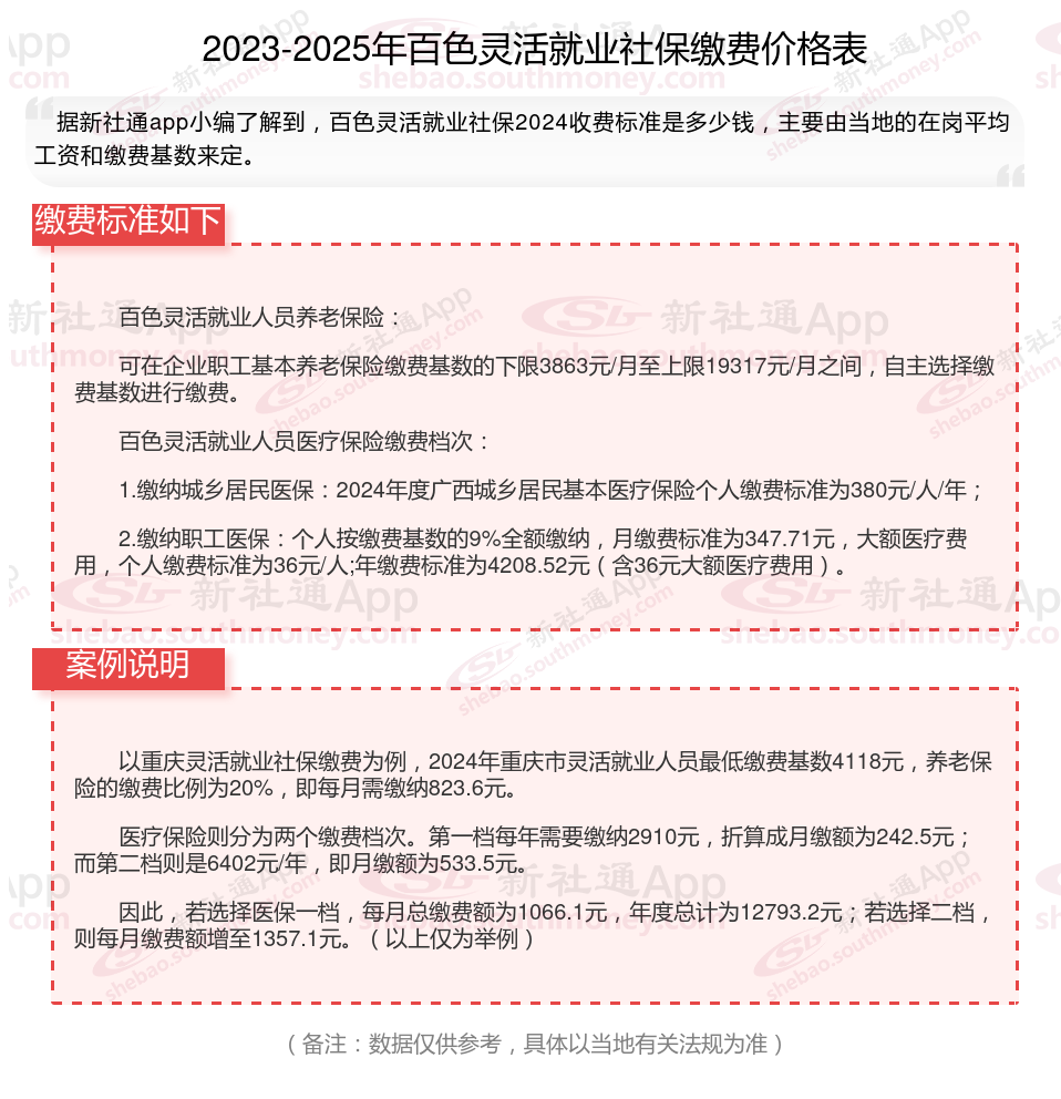 一、2024年百色灵活就业社保缴费标准表 百色灵活就业社保多少钱一个月?