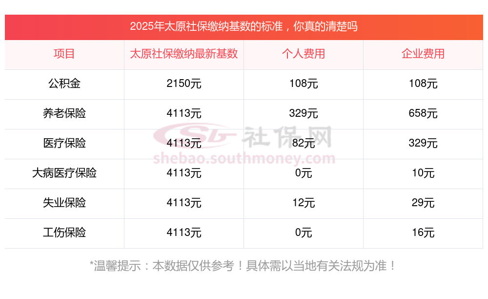 缴纳社保能抵御疾病、失业、养老等重大风险,避免陷入经济困境。也能享受医保报销、养老金增长等红利。社保是劳动者的法定权利,断缴可能影响购房、落户、子女教育等。据新社通小编了解,太原社保公积金基数为:2150.00。那么一个月需要缴纳多少钱?跟着新社通小编一起来了解一下2025年太原社保缴费详情。