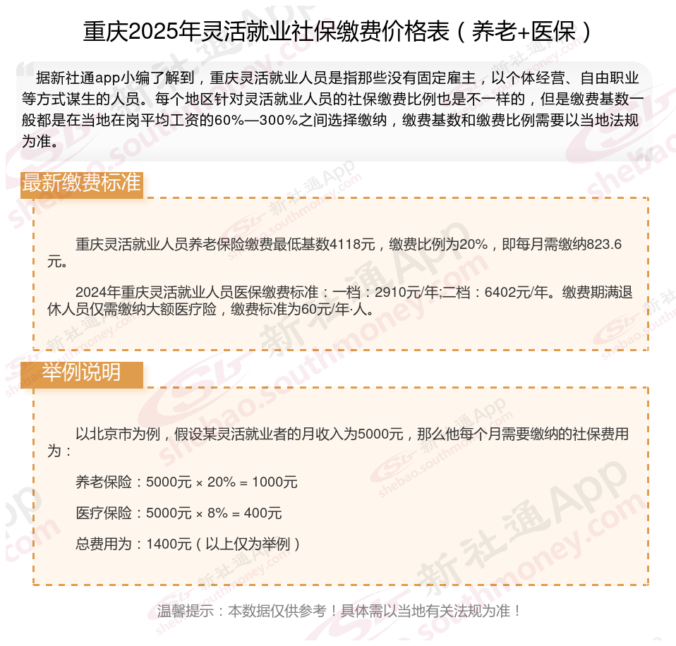 以上就是重庆灵活就业社保缴费的全部内容,数据及内容供参考!希望对你有帮助,欢迎关注新社通解锁更多社保专业资讯。