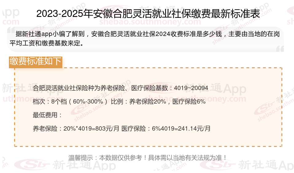 以上就是带来安徽合肥灵活就业社保缴费标准相关知识,内容供参考,希望对你有帮助,欢迎关注/下载新社通app解锁更多社保专业资讯。