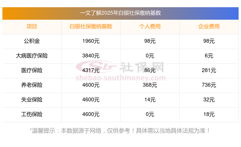 【社保缴多少钱】2025年度最新社保缴费基数是多少?社保缴费基数,就是社保缴纳的缴费标准。接下来随社保君了解一下2025年白银社保交多少钱,2025年白银社保缴费标准的详细内容。