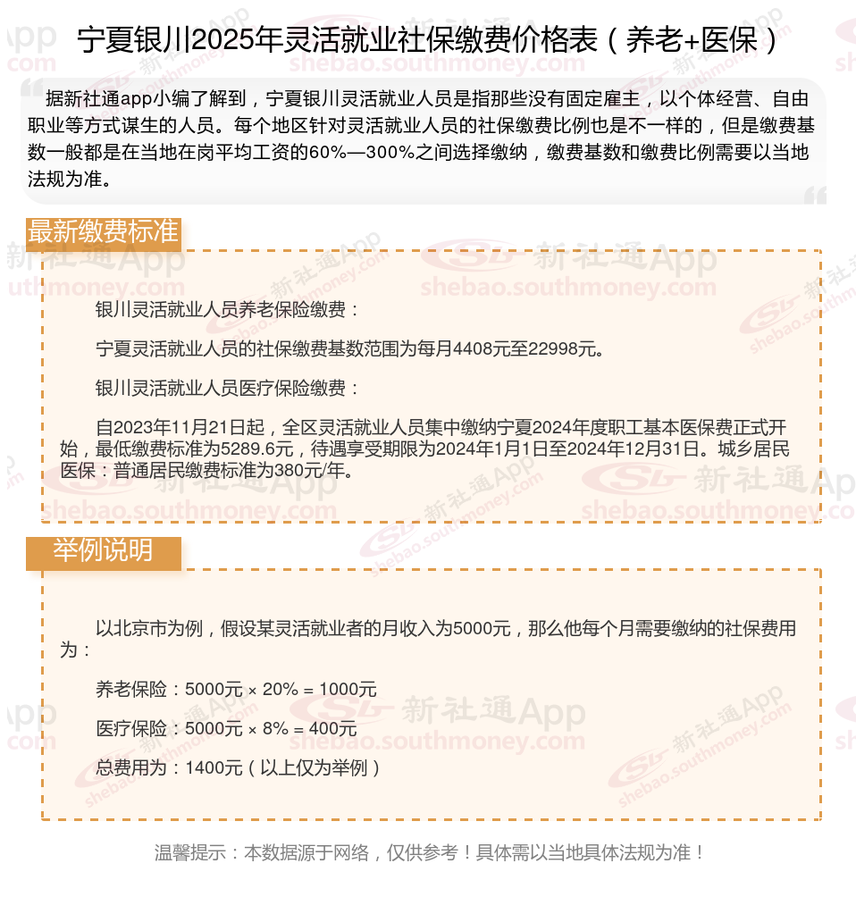 二、2025年宁夏银川灵活就业社保缴费基数及比例最新消息