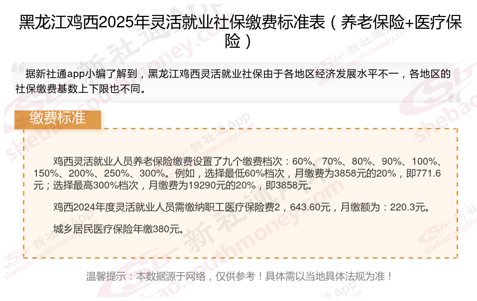 随着经济的发展和社会的进步,灵活就业人员越来越多,但是很多人不知道如何缴纳社保。本文将介绍2025年黑龙江鸡西灵活就业人员社保缴费基数及如何缴纳社保,能领取多少钱,帮助大家更好地了解灵活就业社保,随着新社通APP小编一起了解黑龙江鸡西灵活就业社保缴费最新资讯吧。