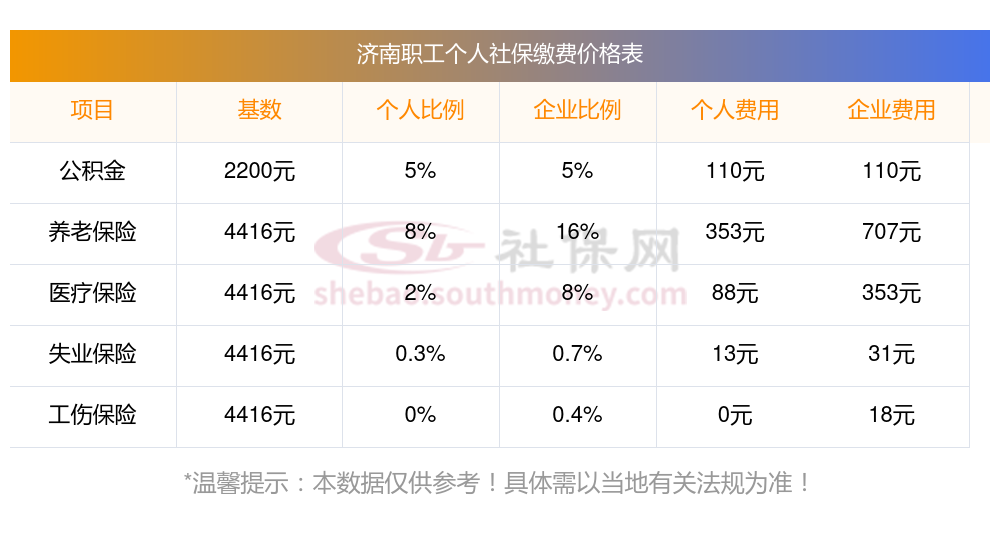 据新社通小编了解到,济南职工社保缴费基数为:4416.00,个人费用约为:353.28元,企业费用约为:706.56元。