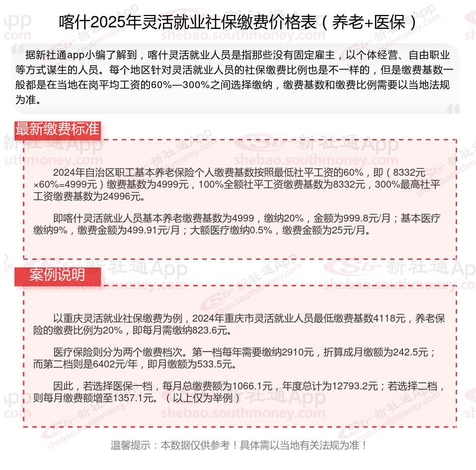 灵活就业社保缴费法规继续完善,涵盖了养老保险、医疗保险、失业保险等多个方面,旨在为灵活就业人员提供全面的社会保证。接下来随社保君了解一下2025年喀什灵活就业人员社保交多少钱的详细内容。