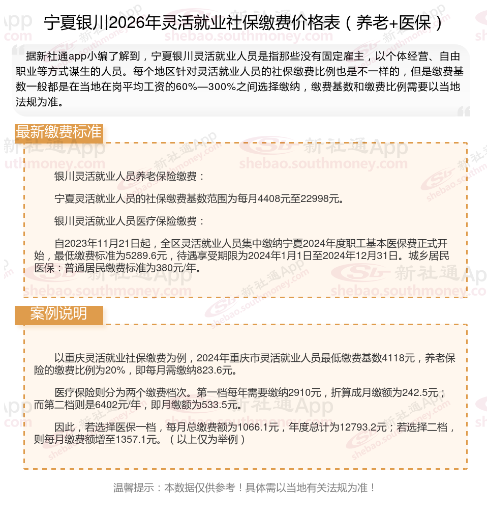 以上就是宁夏银川灵活就业社保缴费的全部内容,数据及内容供参考!希望对你有帮助,欢迎关注新社通解锁更多社保专业资讯。