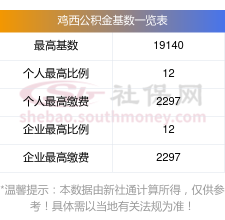 按照鸡西市相关部门公布的2022年鸡西市城镇非私营单位就业人员年平均工资计算,本年度缴存基数上限为19140元;根据黑龙江有关部门关于调整我省最低工资标准的法定,本年度缴存基数下限为1610元。
