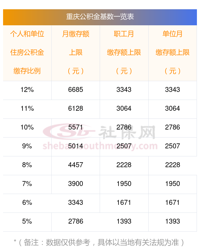 (二)住房公积金月缴存额上限:2023年度重庆住房公积金月缴存额上限为6686元(单位和职工合计)。