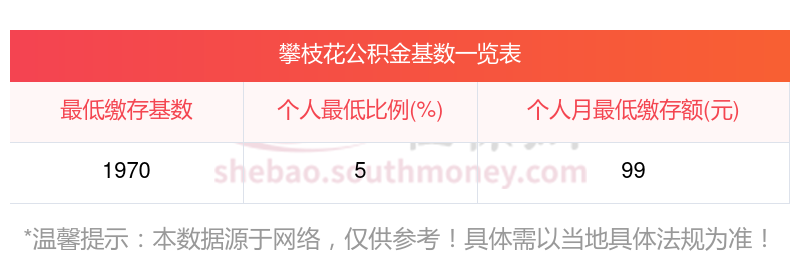 (三)住房公积金月缴存额下限:2023年度攀枝花住房公积金月缴存额下限为198元(单位和职工合计)。