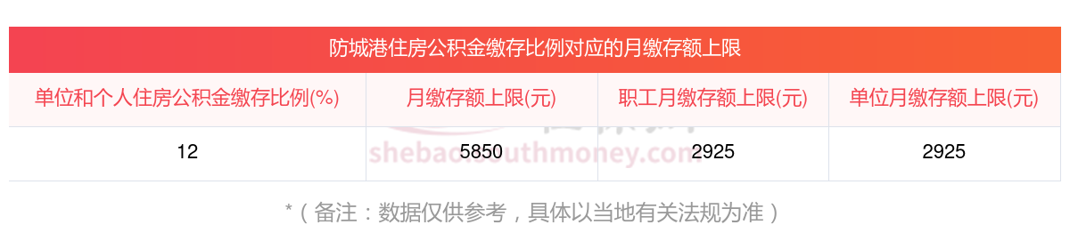 (二)住房公积金月缴存额上限:2024年度防城港住房公积金月缴存额上限为5850元(单位和职工合计)。