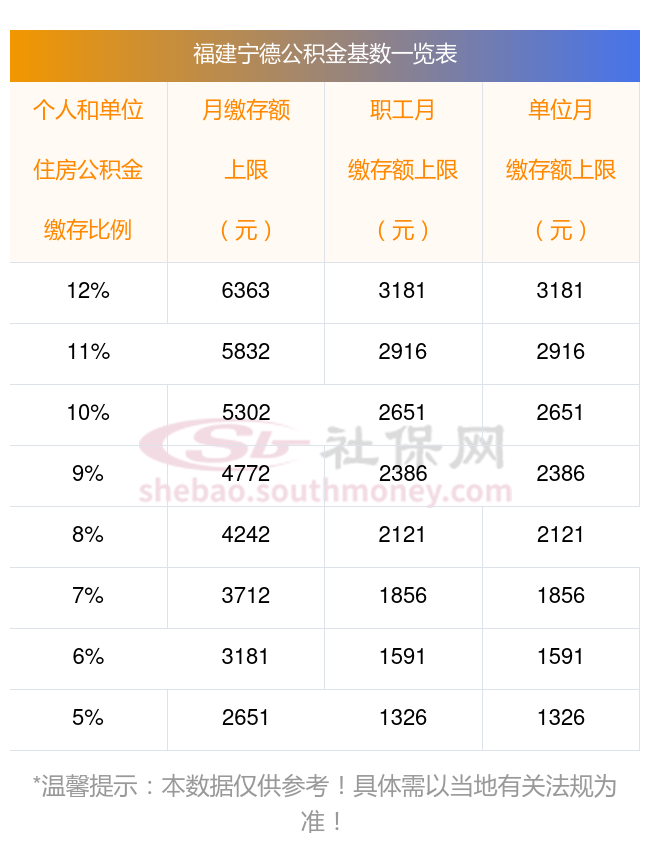 (二)住房公积金月缴存额上限:2024年度福建宁德住房公积金月缴存额上限为6362元(单位和职工合计)。