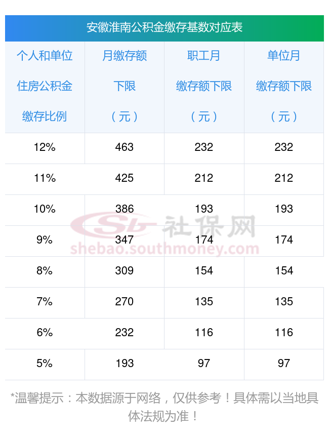 住房公积金缴存基数不超过职工工作所在地有关部门公布的上年度职工月平均工资的3倍,不低于安徽省淮南市有关部门法定的最低工资标准。