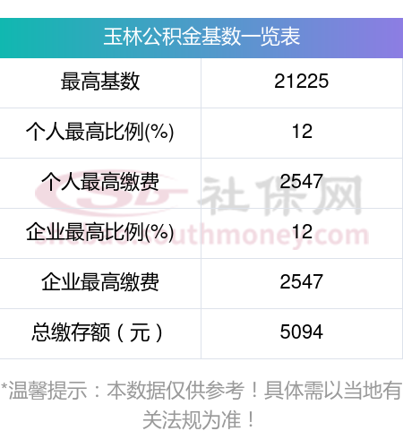 2024年玉林公积金基数上限:21225
