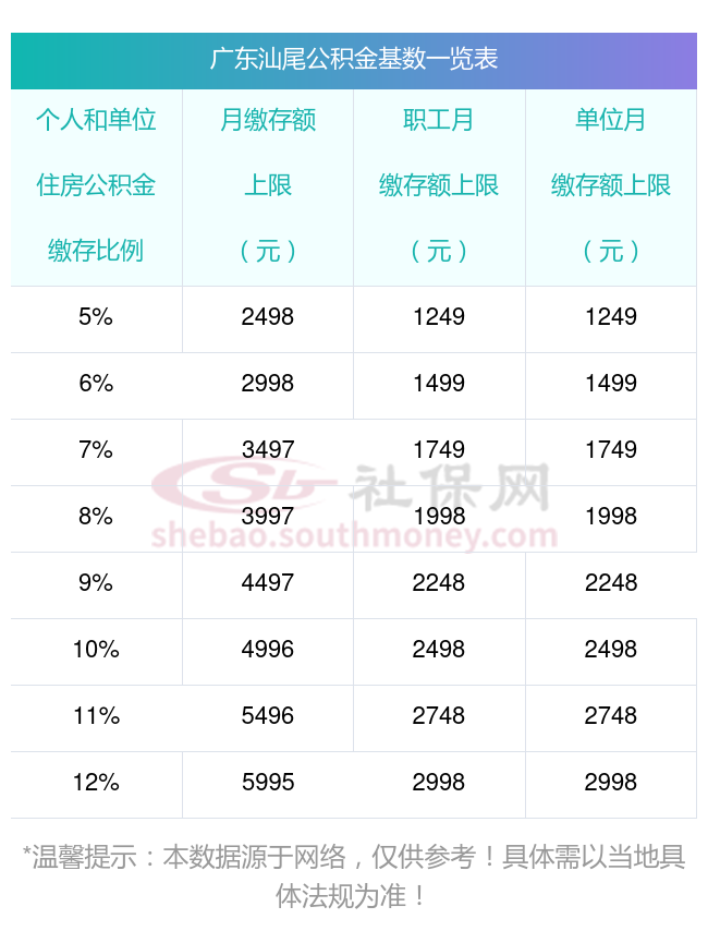 广东汕尾住房公积金缴存基数以职工本人上一年度月平均工资计算。