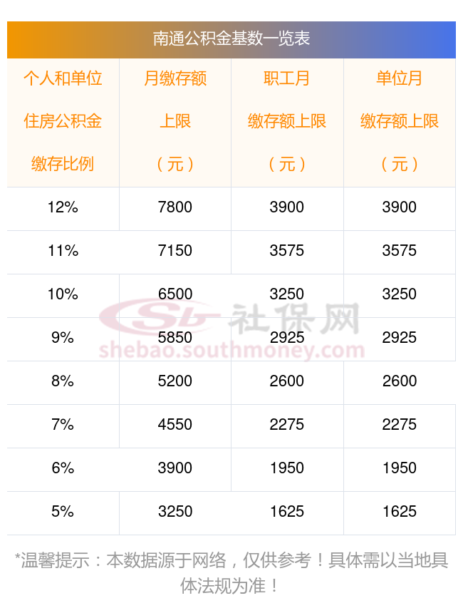(二)住房公积金月缴存额上限:2023年度南通住房公积金月缴存额上限为7800元(单位和职工合计)。
