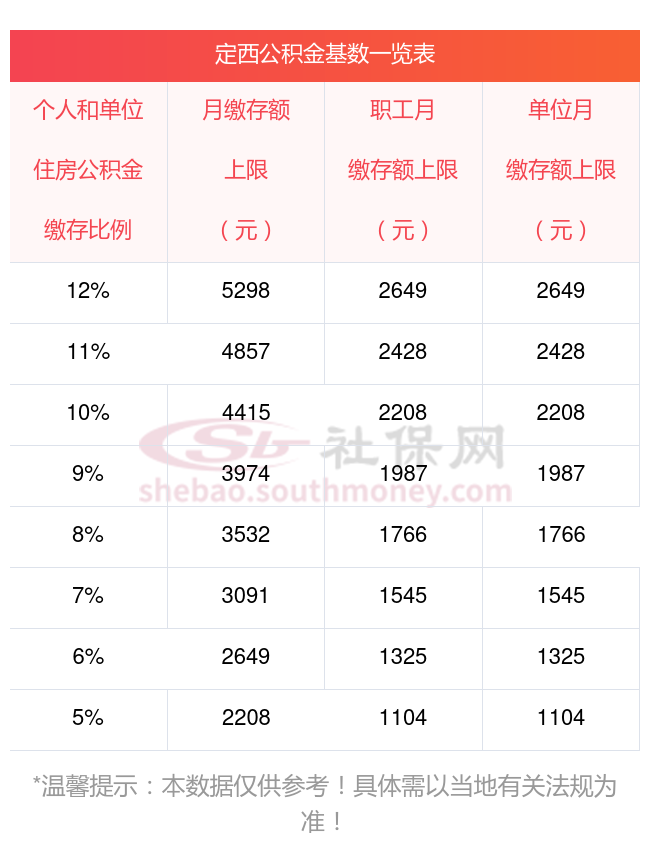 (二)住房公积金月缴存额上限:2024年度定西住房公积金月缴存额上限为5298元(单位和职工合计)。