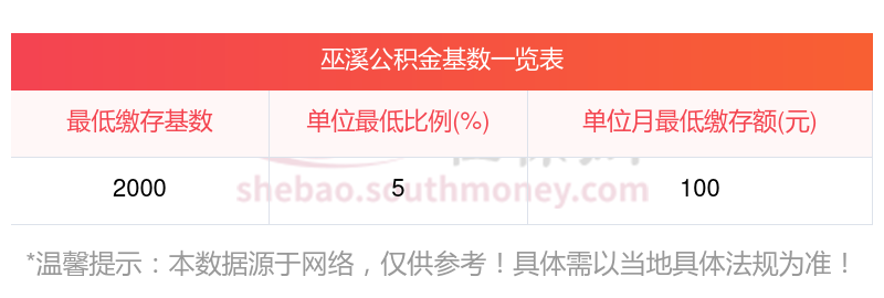 (3)最低月缴存额为巫溪为 200元(其中:单位100 元,个人100元)。