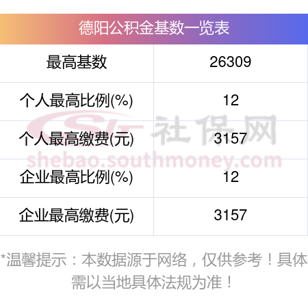按照德阳市相关部门公布的2023年德阳市城镇非私营单位就业人员年平均工资计算,本年度缴存基数上限为26309元;根据四川有关部门关于调整我省最低工资标准的法定,本年度缴存基数下限为1970元。
