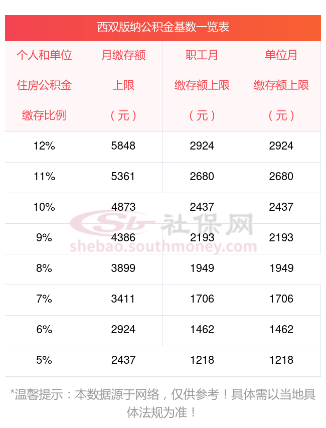 (二)住房公积金月缴存额上限:2022年度西双版纳住房公积金月缴存额上限为5848元(单位和职工合计)。