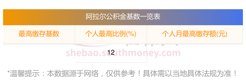 阿拉尔住房公积金月缴存额上限是多少?住房公积金缴存比例及基数范围如下: