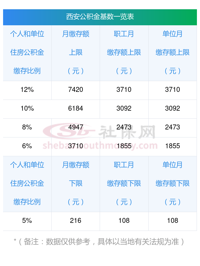 根据了解得知,一般住房公积金的缴存比例档次有8个档,分别是5%、6%、7%、8%、9%、10%、11%、12%,其中5%是最低档次,12%是最高档次。但不同的地区有不同的设定,具体根据当地公布的档次选择,比如当前的西安公积金的最低缴存比例是5%,最高缴存比例是12%。