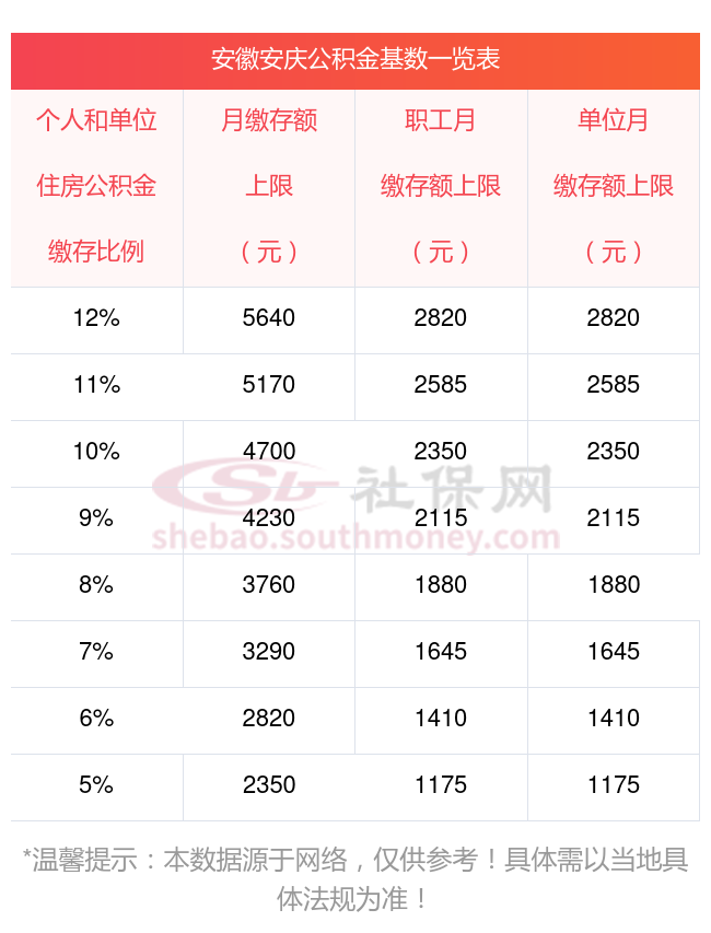 (二)住房公积金月缴存额上限:2024年度安徽安庆住房公积金月缴存额上限为5640元(单位和职工合计)。