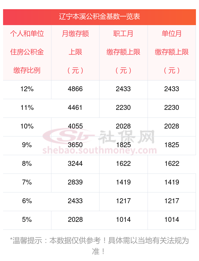 (二)住房公积金月缴存额上限:2024年度辽宁本溪住房公积金月缴存额上限为4866元(单位和职工合计)。
