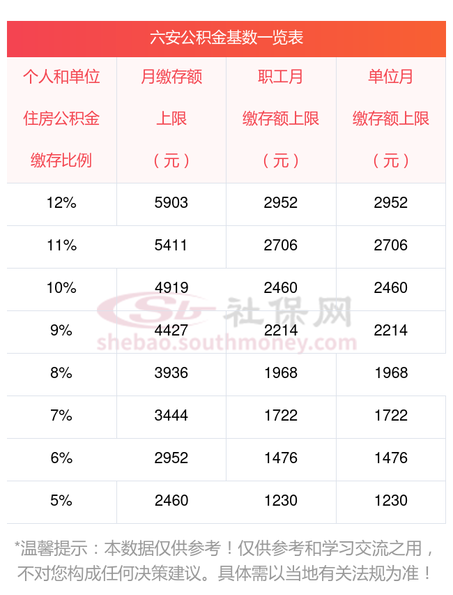 (二)住房公积金月缴存额上限:2024年度六安住房公积金月缴存额上限为5904元(单位和职工合计)。