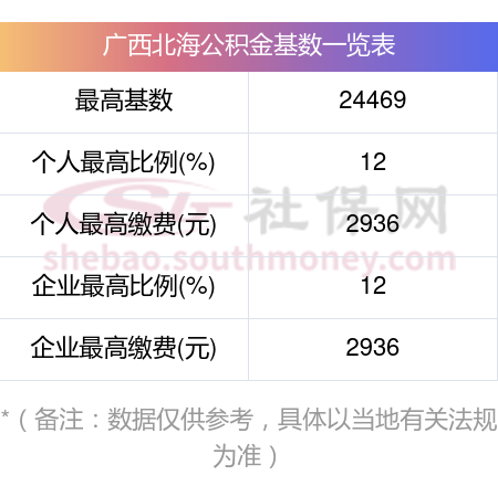 (二)住房公积金月缴存额上限:2024年度广西北海住房公积金月缴存额上限为5872元(单位和职工合计)。
