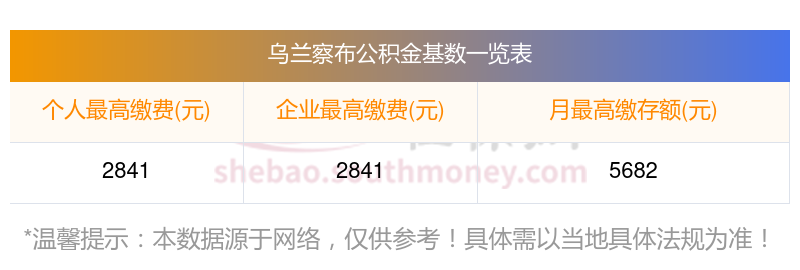 (二)住房公积金月缴存额上限:2024年度乌兰察布住房公积金月缴存额上限为5682元(单位和职工合计)。
