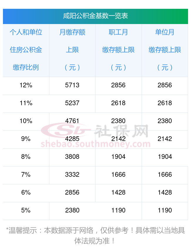 (二)住房公积金月缴存额上限:2024年度咸阳住房公积金月缴存额上限为5712元(单位和职工合计)。