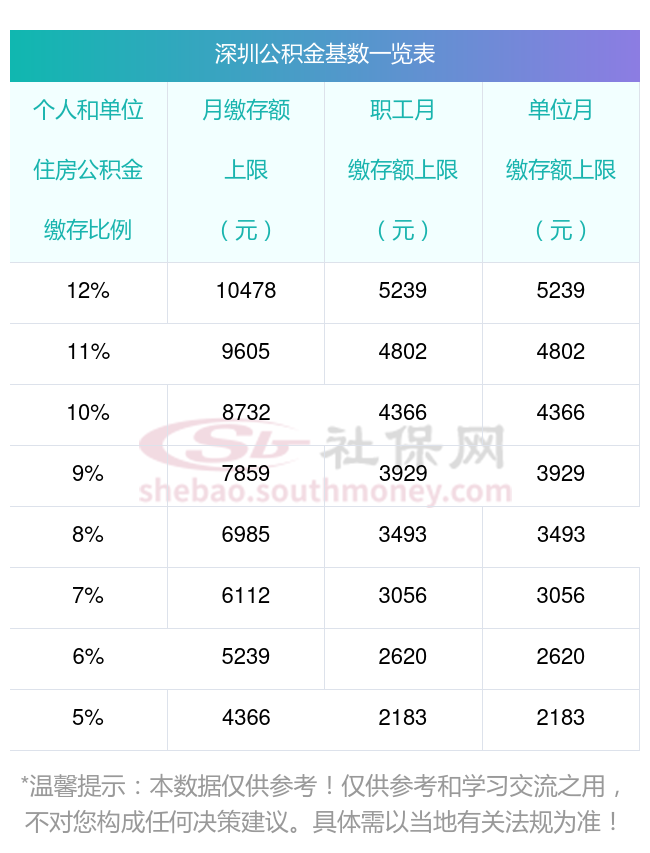 最新深圳的住房公积金缴存基数范围是2420~35283,上限比例范围是5%-12%。