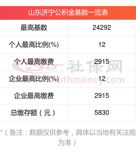 按照山东济宁市相关部门公布的2024年山东济宁市城镇非私营单位就业人员年平均工资计算,本年度缴存基数上限为24292元。