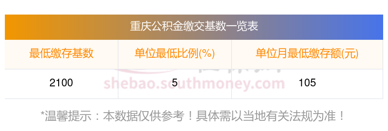 重庆住房公积金月缴存额下限是多少?住房公积金缴存比例及基数范围如下: