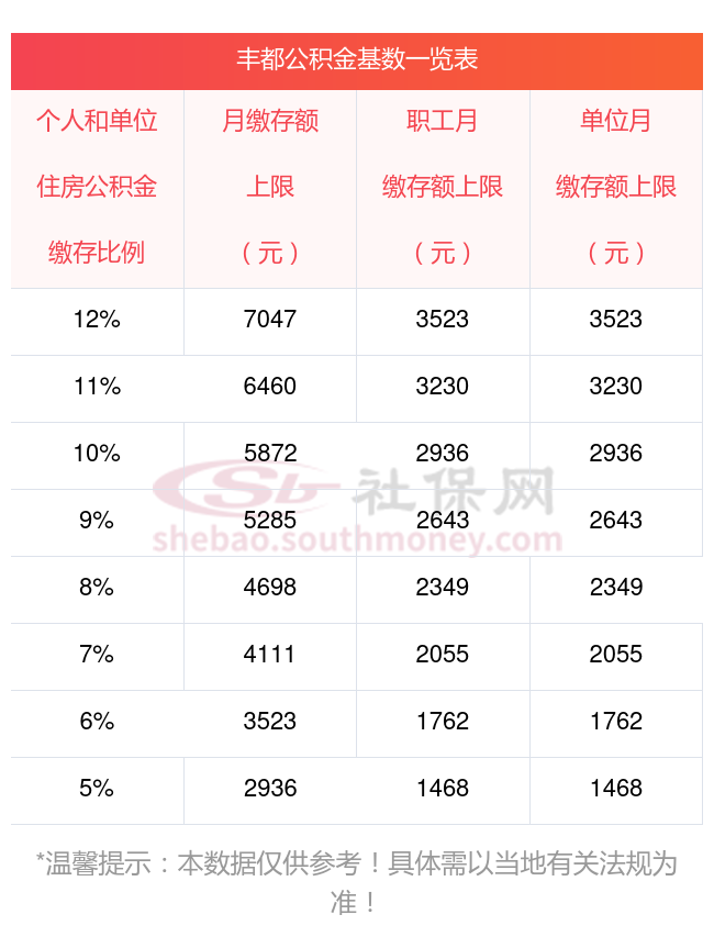 每月缴纳的住房公积金上限有封顶吗?最新丰都2025年-2026年职工缴存的住房公积金费用最高上限35283,需要提醒的,各地的公积金的缴费基数和比例是不一样的,因此,社保一金中的公积金每年要交多少钱也是因地而异的。一起来看看最新公积金基数数据列表