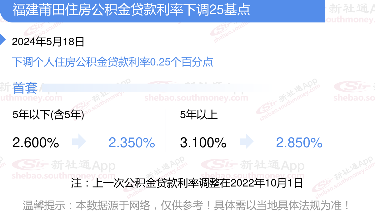一、自2024年5月18日起,下调首套个人住房公积金贷款利率0.25个百分点,即五年以下(含五年)首套个人住房公积金贷款利率由2.600%下调至2.350%,五年以上首套个人住房公积金贷款利率由3.100%下调至2.850%。