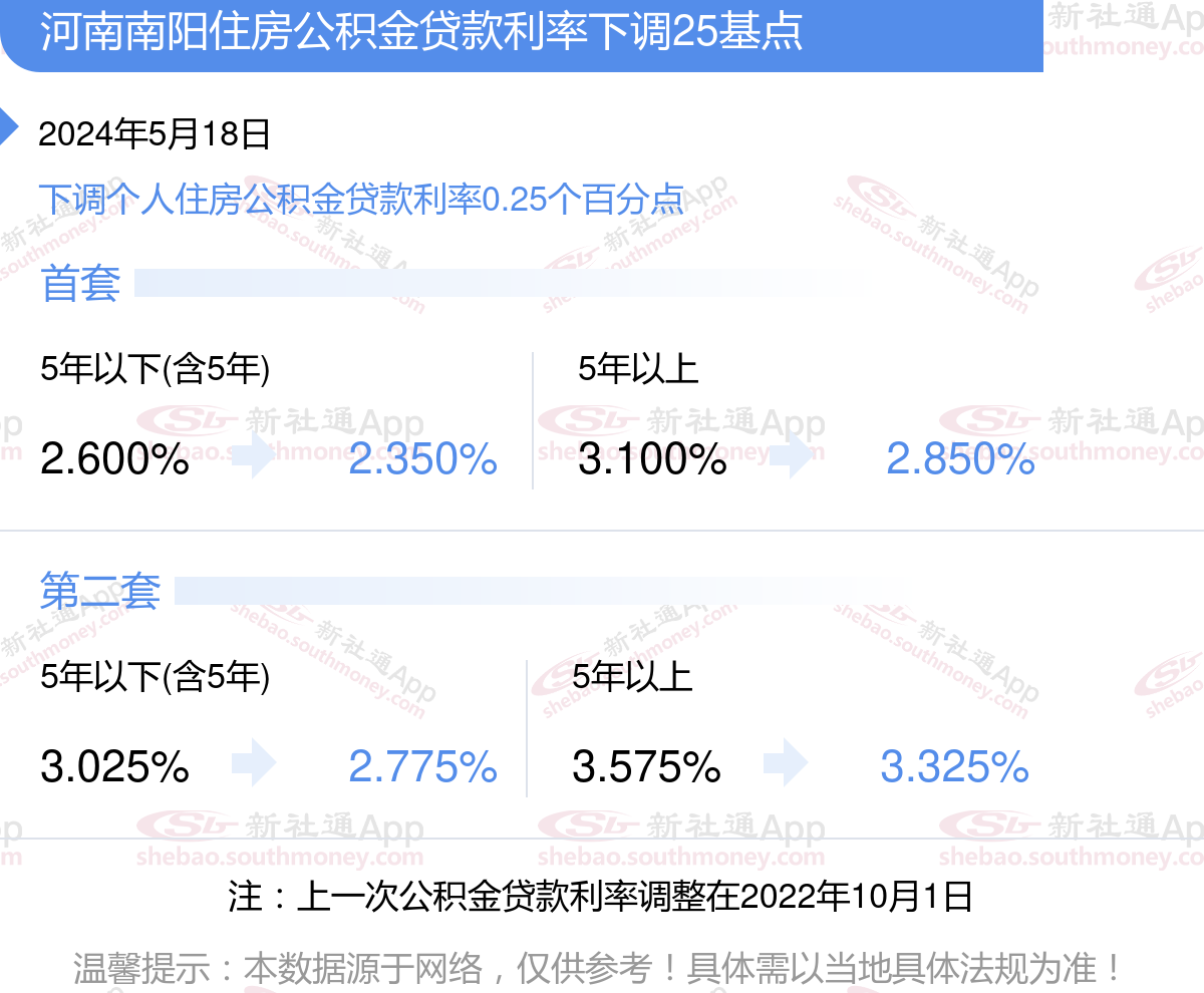 央行下调个人住房公积金贷款利率,首套和二套房利率分别调整为2.350%、2.850%和不低于2.775%、3.325%,自2024年5月18日起执行。多地跟进调整,具体可查询当地公积金官网。那现在河南南阳住房公积金贷款利率调整后是多少?河南南阳个人住房贷款利率最低是多少?下面是新社通APP小编整理的相关住房公积金贷款利率及计算方法的知识,快收藏好了!