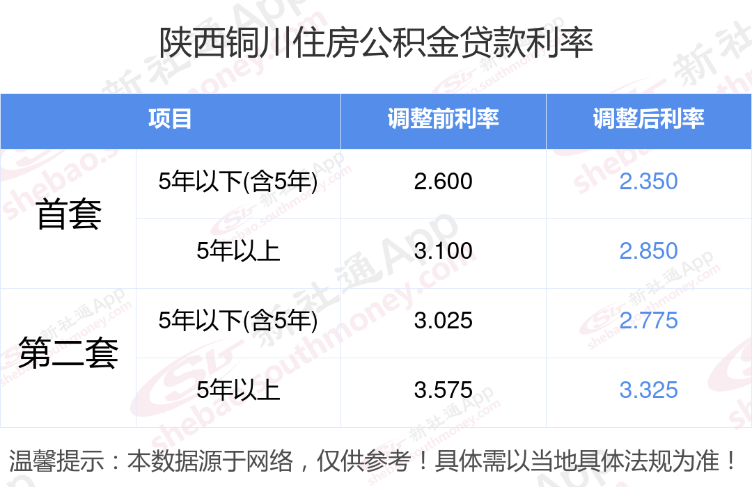 最新央行下调个人住房公积金贷款利率,首套和二套房利率分别调整为2.350%、2.850%和不低于2.775%、3.325%,自2024年5月18日起执行。多地跟进调整,具体可查询当地公积金官网。那现在陕西铜川住房公积金贷款利率调整后是多少?陕西铜川个人住房贷款利率最低是多少?下面是新社通APP小编整理的相关住房公积金贷款利率及计算方法的知识,快收藏好了!
