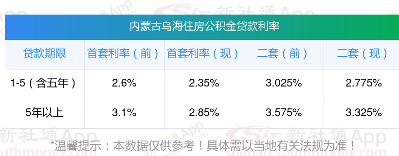 央行下调个人住房公积金贷款利率,首套和二套房利率分别调整为2.350%、2.850%和不低于2.775%、3.325%,自2024年5月18日起执行。多地跟进调整,具体可查询当地公积金官网。那现在内蒙古乌海住房公积金贷款利率调整后是多少?内蒙古乌海个人住房贷款利率最低是多少?下面是新社通APP小编整理的相关住房公积金贷款利率及计算方法的知识,快收藏好了!
