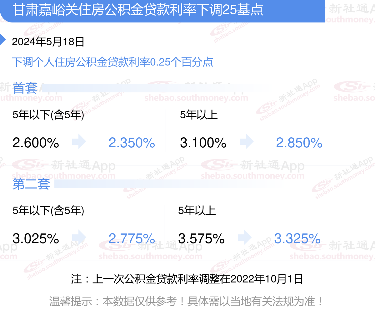 近日,中国人行宣布,自5月18日起,下调个人住房公积金贷款利率0.25个百分点,5年以下(含5年)和5年以上首套个人住房公积金贷款利率分别调整为2.350%和2.850%,5年以下(含5年)和5年以上第二套个人住房公积金贷款利率分别调整为不低于2.775%和3.325%。现在甘肃嘉峪关个人住房贷款利率最低是多少?下调的公积金贷款利率后办理可以省下多少钱的?下面是新社通APP小编整理的相关贷款知识,希望能帮助到你。