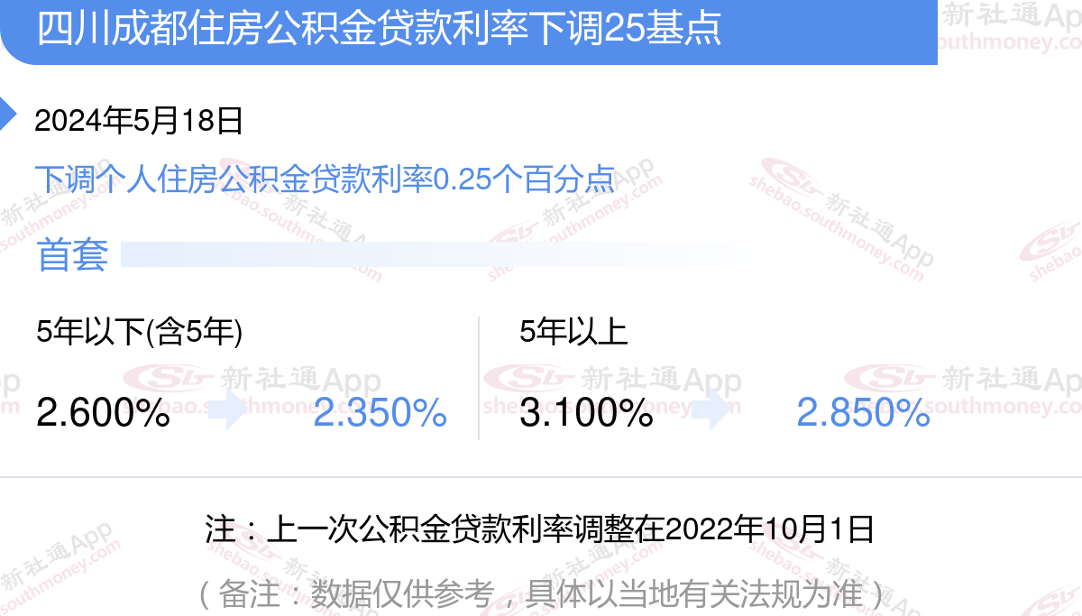 四川成都调整2024年住房公积金贷款利率标准及执行时间一、自2024年5月18日起,下调首套个人住房公积金贷款利率0.25个百分点,即五年以下(含五年)首套个人住房公积金贷款利率由2.600%下调至2.350%,五年以上首套个人住房公积金贷款利率由3.100%下调至2.850%。
