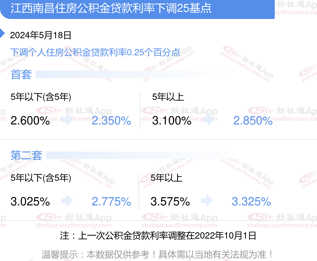 江西南昌最新一次住房公积金贷款利率调整什么时候?在2024年517起发出通告,住房公积金个人住房贷款利率下调0.25个百分点,为购房者带来实惠。新规覆盖新申请及已放款贷款,预计可节省数万元。公积金助力中低收入家庭购房,服务体验升级,安全有保证。那想要在江西南昌办理的购房贷款利率,现在执行的公积金贷款首套房利率是多少?二套房利率又是多少?下面是新社通APP小编整理的相关贷款知识,希望能帮助到你。