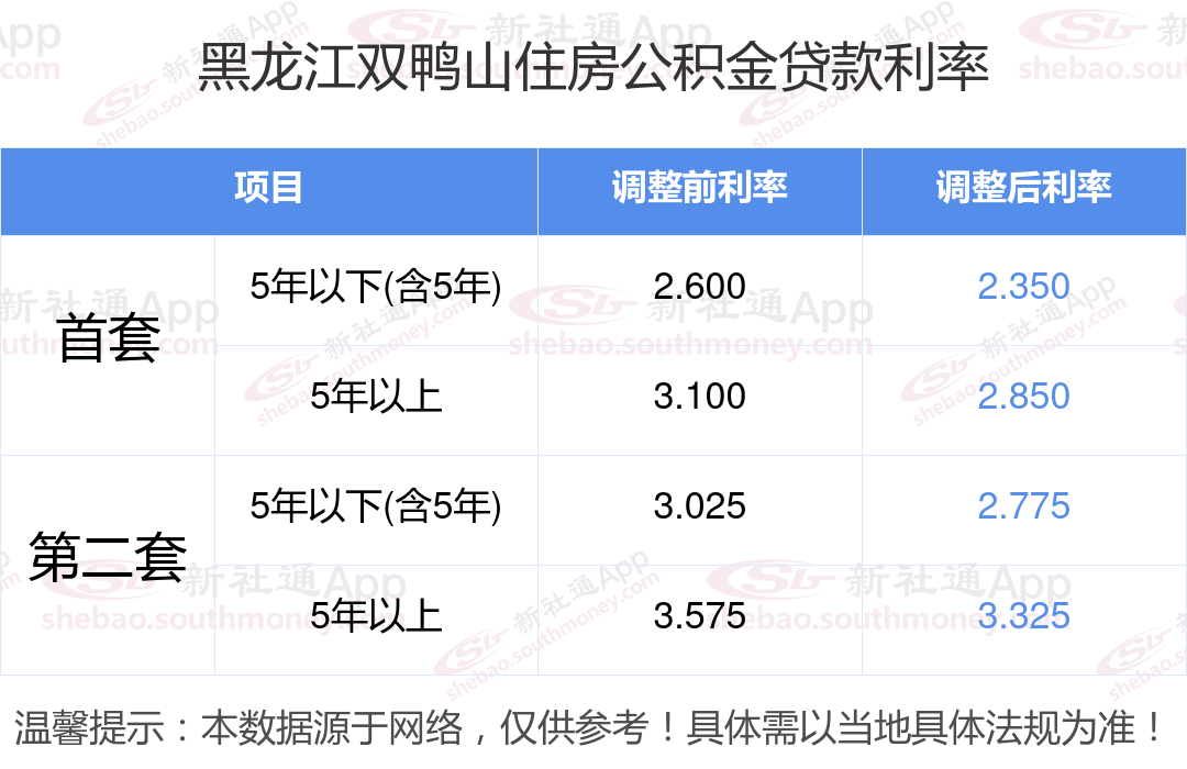 央行下调个人住房公积金贷款利率,首套和二套房利率分别调整为2.350%、2.850%和不低于2.775%、3.325%,自2024年5月18日起执行。多地跟进调整,具体可查询当地公积金官网。那现在黑龙江双鸭山住房公积金贷款利率调整后是多少?黑龙江双鸭山个人住房贷款利率最低是多少?下面是新社通APP小编整理的相关住房公积金贷款利率及计算方法的知识,快收藏好了!