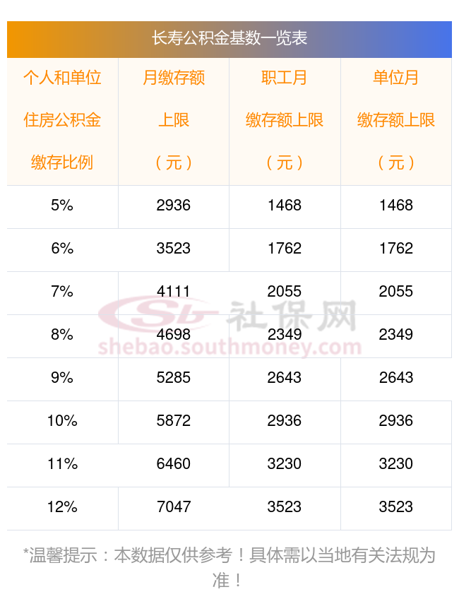 每月缴纳的住房公积金你了解多少?2025年长寿住房公积金年度住房公积金缴存基数上限为35283元。如按照12%的缴存比例,最高每月可缴存8468元,对于不同的缴存比例对于的缴纳金额是不一样的。