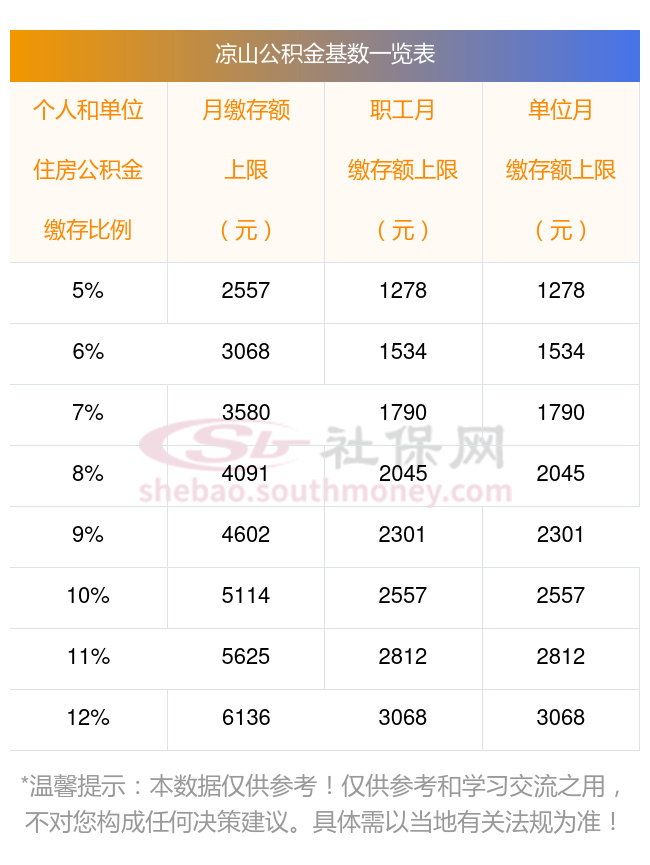 每月缴纳的住房公积金你了解多少?2025年凉山住房公积金年度住房公积金缴存基数上限为35283元。如按照12%的缴存比例,最高每月可缴存8468元,对于不同的缴存比例对于的缴纳金额是不一样的。