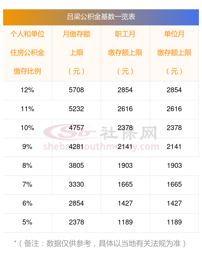 以下举例,可以从吕梁不同比例计算得知公积金每月缴存额度的。