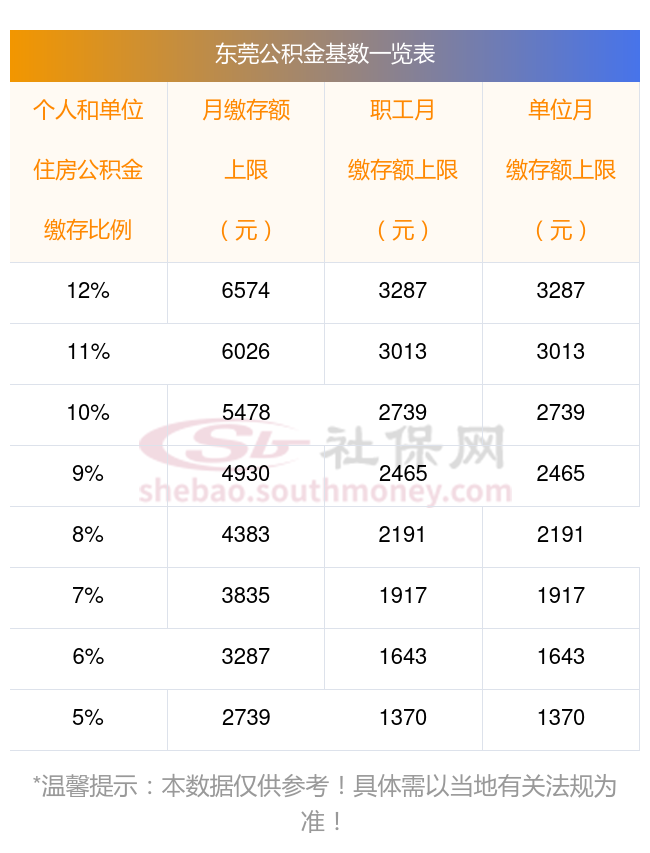 以下举例,可以从东莞不同比例计算得知公积金每月缴存额度的。